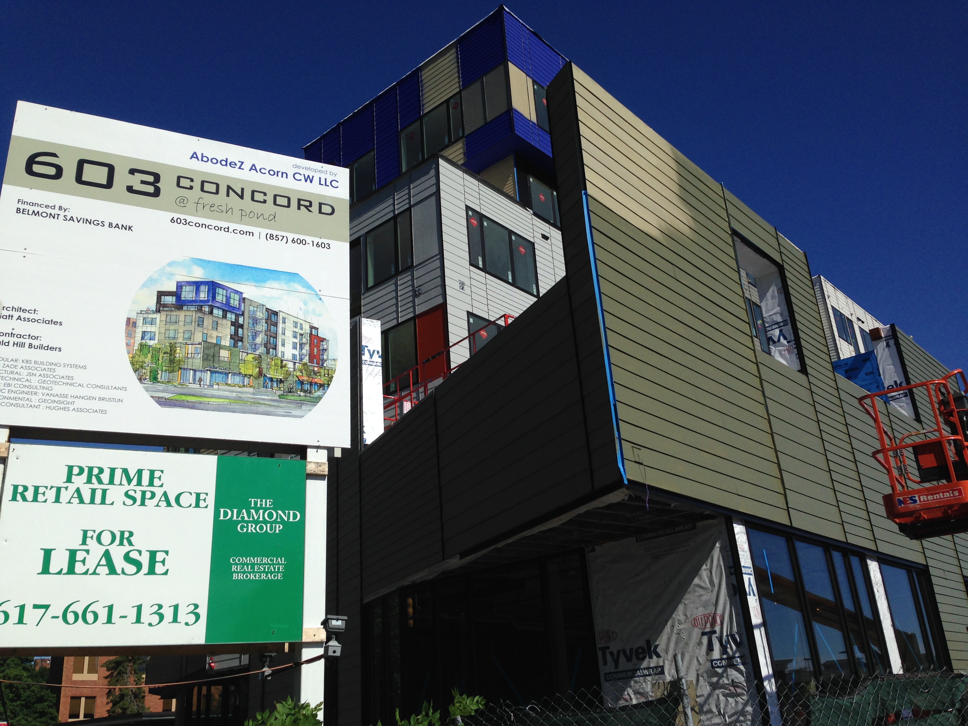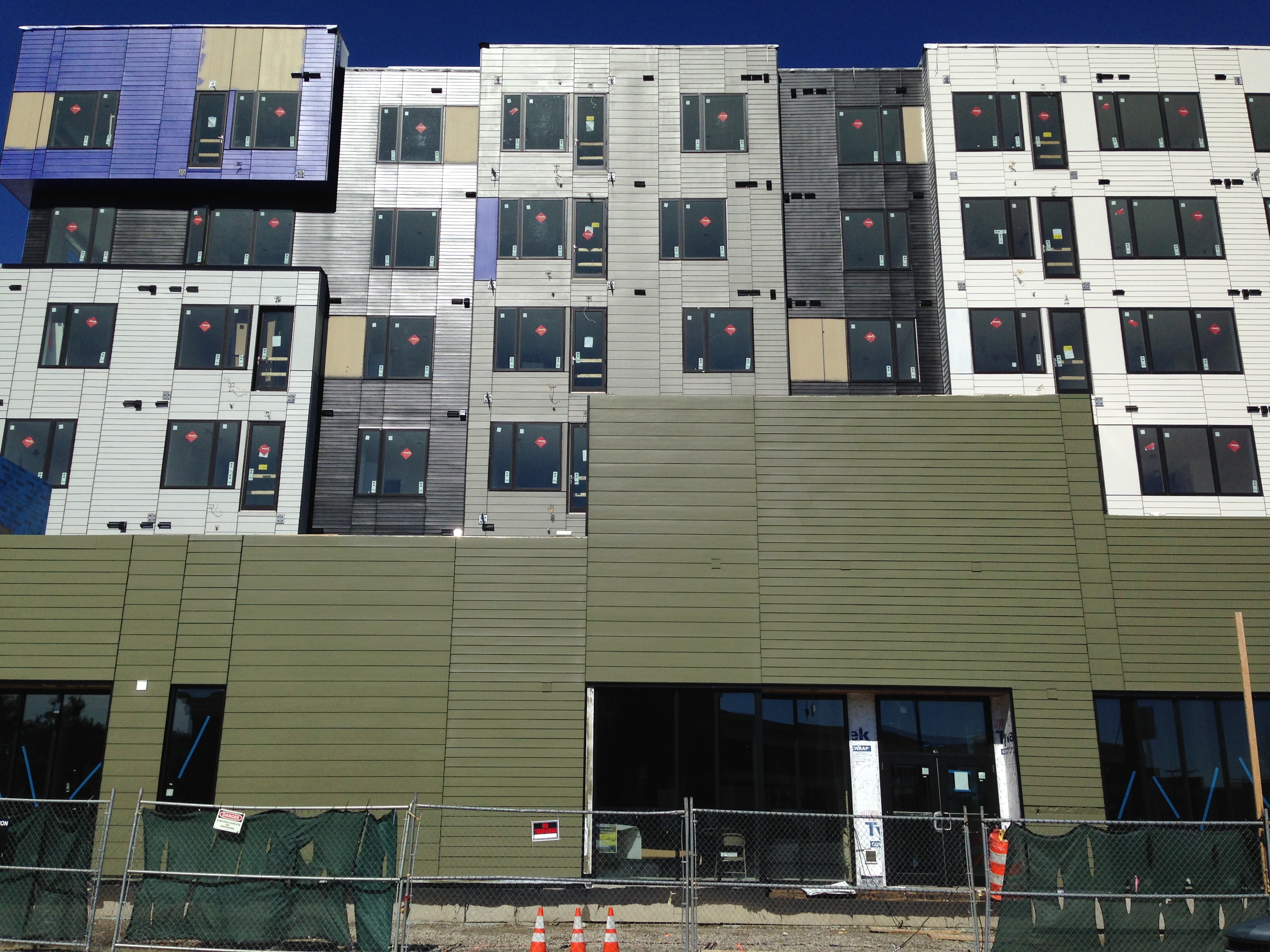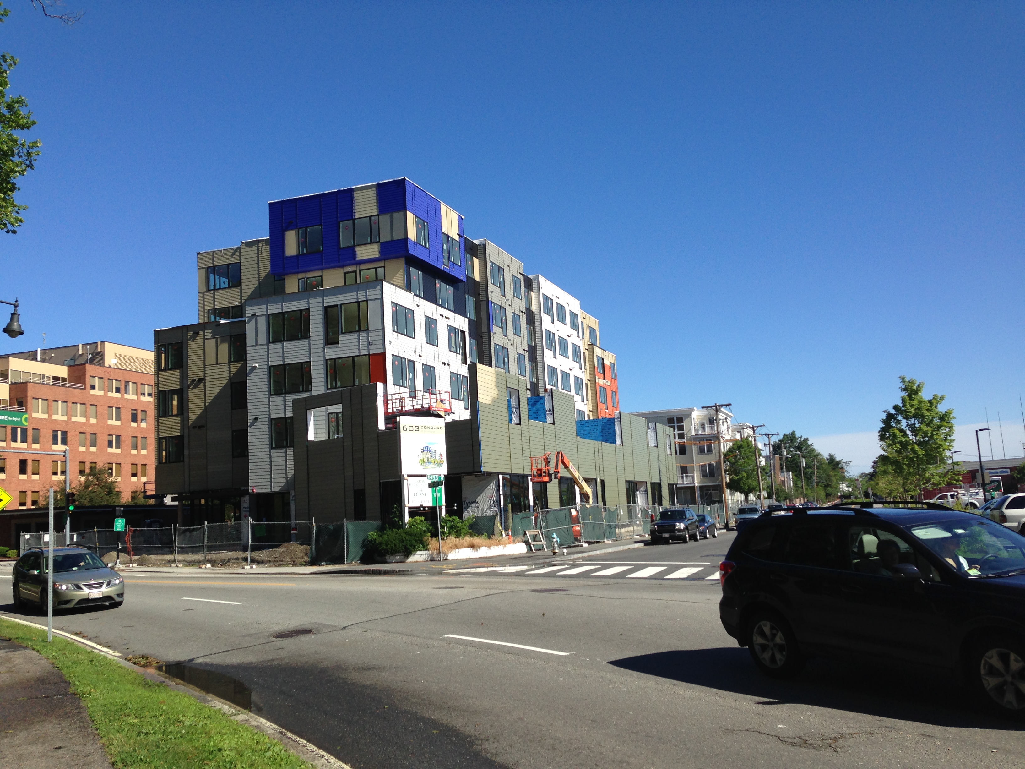 This idea struck me today, as I walked past the new apartment building going up on the corner of Concord Avenue and Wheeler Street. A sign identifying the project includes one of the renderings, inviting a side-by-side comparison to the reality. Compare the photos below with the renderings: