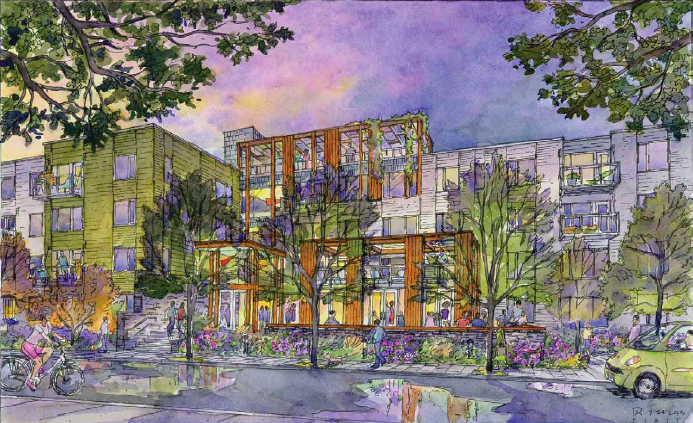 Wouldn’t it be nice if we could all live in the dreamscape neighborhoods depicted in architectural renderings? The sun is always shining, traffic is minimal, and the people look so carefree and unhurried. The warm light in watercolor washes is so flattering, especially to building materials like concrete clapboard that up close don’t look so soft around the edges.