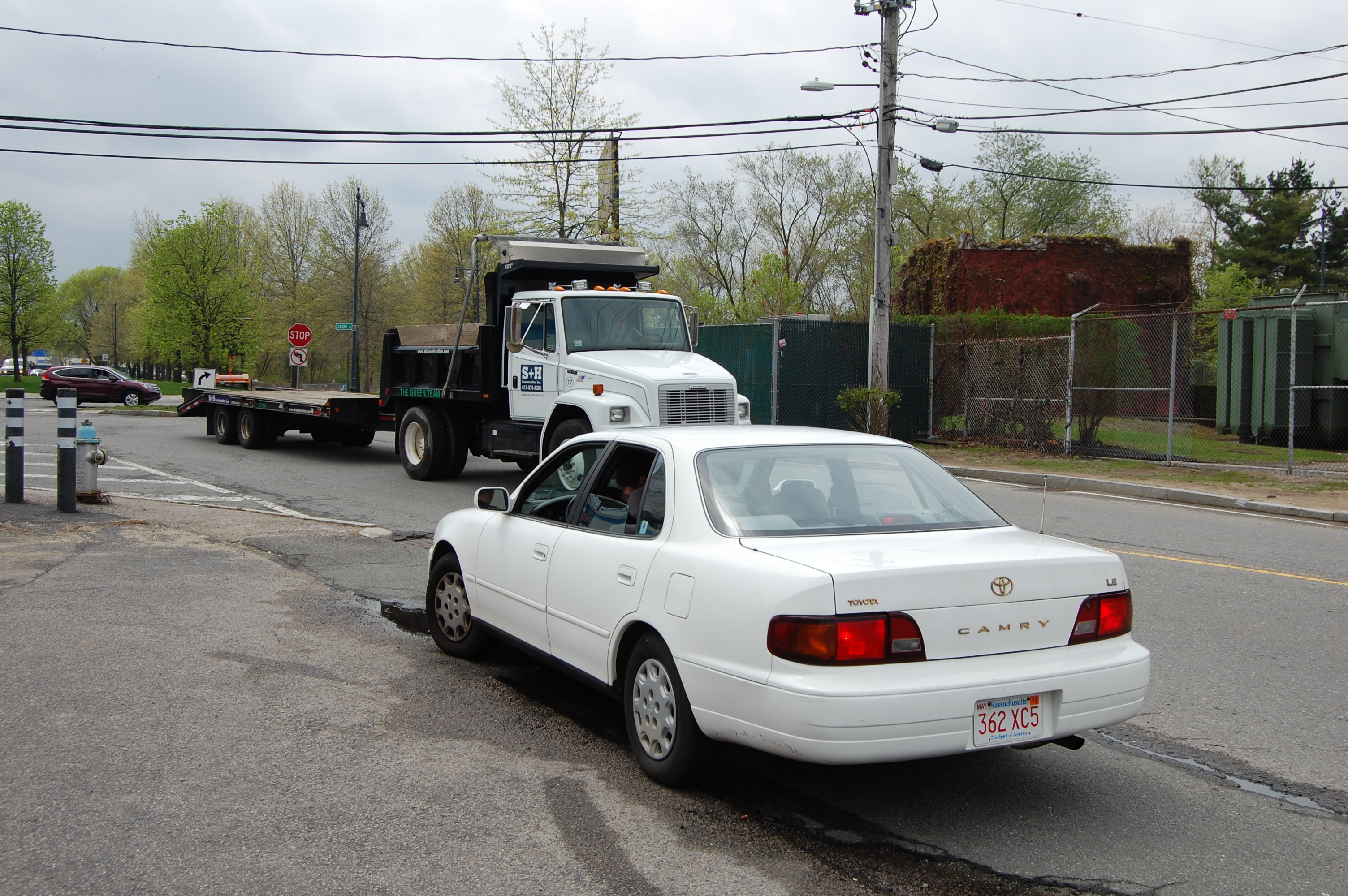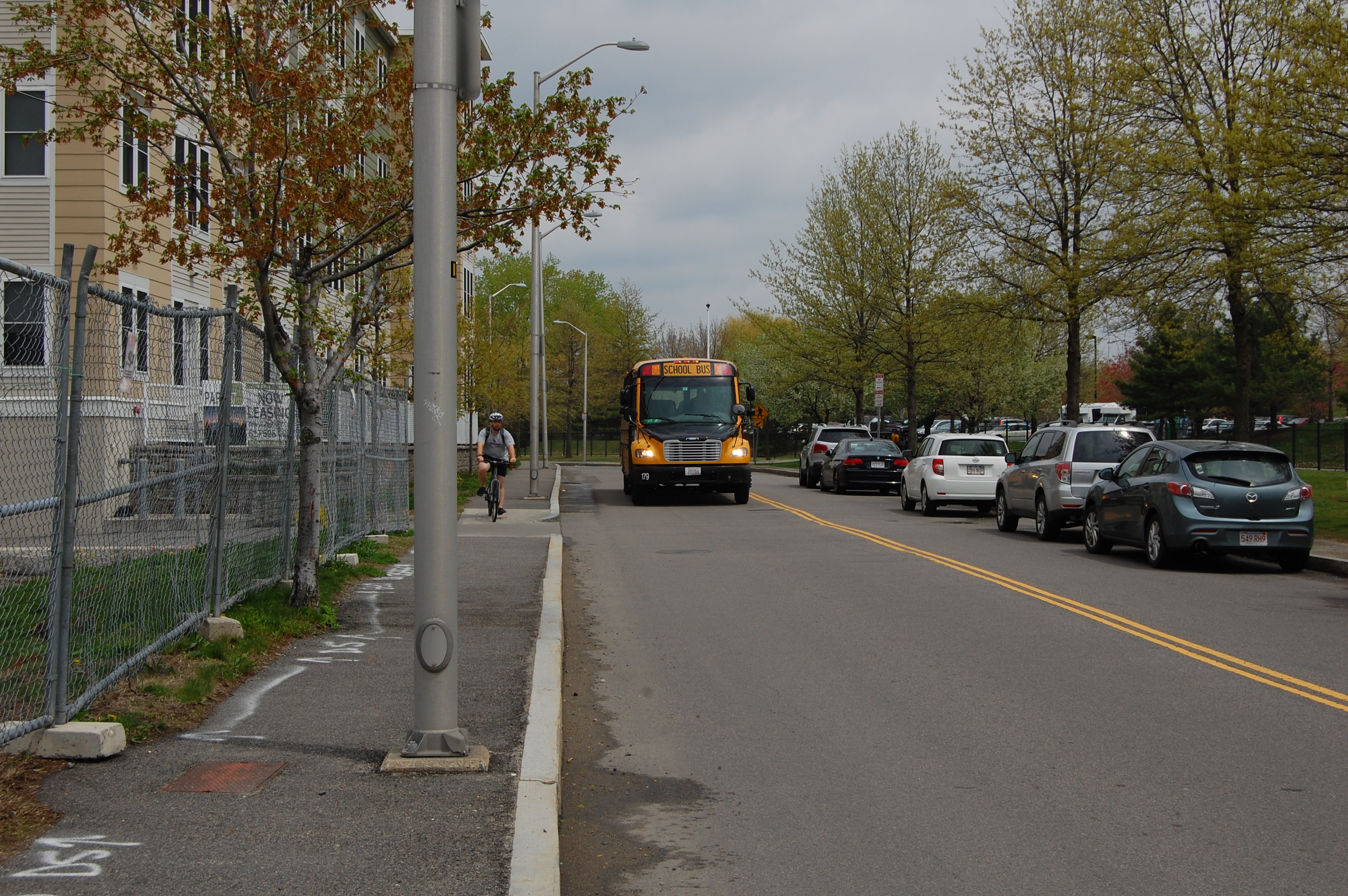 We have examined a number of mature and recent tree planting examples along Cambridge public ways, and it is clear that the trees planted in a deep, green base away from the curb are healthier, less subject to vehicular and snow plow damage, and less likely to undermine the sidewalk and street pavement over time. While we understand there is an interest in the creation of a tree canopy over the street as the trees mature — an esthetic goal we share — this can be accomplished by allowing the trees to grow taller so that the eventual canopy does not interfere with the illumination of the street, sidewalk and cycle track. Good lighting is critical to the safety of vehicles, pedestrians and cyclists. Healthy, mature street trees will play a important role in mitigating the pronounced heat island effect of all the paved areas around the mall and the artificial turf fields at Danehy Park. Mature trees will also assist with stormwater management on a street prone to flooding and provide clean air benefits to offset fumes diesel trucks idling in the mall loading docks and from the auto repair businesses on New Street as well as low-level methane releases from the vents in the park.