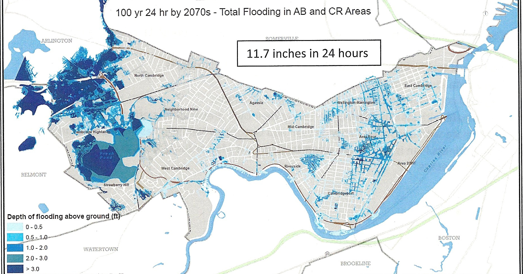 The Fresh Pond/Alewife area has always been vulnerable to flooding, even without the looming threat of rising sea levels and increased precipitation predicted with climate change. As our area comes under intense development pressure, the FPRA is concerned with how to design new buildings and retrofit established neighborhoods to withstand periodic flooding and how to protect sensitive areas like Fresh Pond Reservoir (the city’s water supply) and the Alewife Reservation (a protected wetland habitat) from increased, polluted stormwater runoff. For over two years the city has been preparing a Climate Change Vulnerability Assessment that will inform new planning and building regulations as well as emergency response measures. The interim results will be presented on Tuesday, March 17 at 6:00 pm (NEW DATE) at MIT in the Stata Canter’s Kirsch Auditorium.. And, if you think a warming climate will mean fewer massive snowfalls like this, read this article on research by an MIT climate scientist.